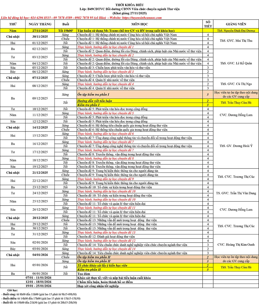 LỊCH HỌC TOÀN KHÓA:
