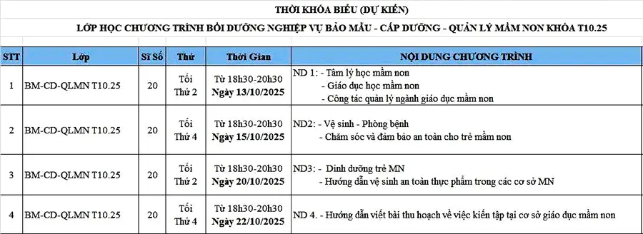 Lịch học lớp Bảo mẫu, cấp dưỡng, QLMN tháng 10/2025