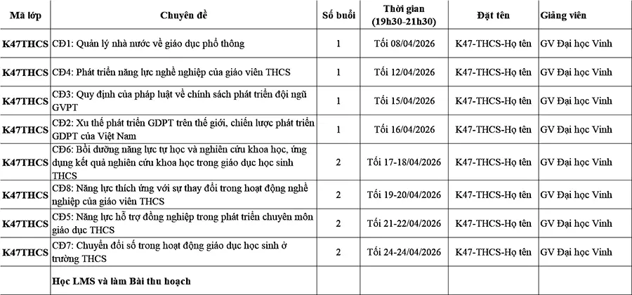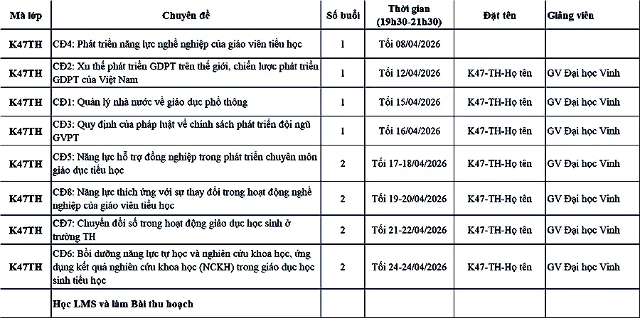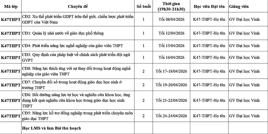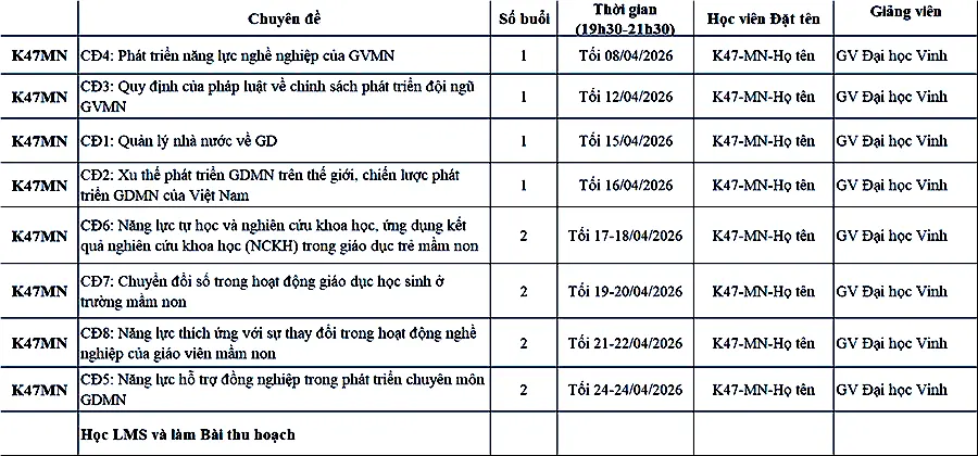 Lịch học lớp Chuẩn chức danh GV Mầm non, Tiểu học, THCS, THPT V47