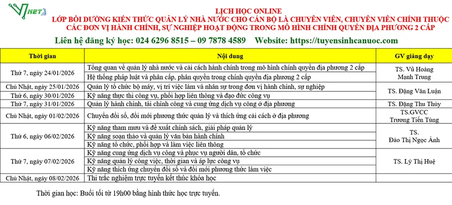 Lịch học lớp Chuyên viên, Chuyên viên chính 24-01-2026