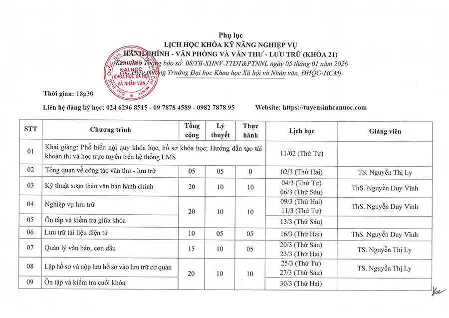 Lịch học lớp Hành chính văn phòng và Văn thư lưu trữ Khóa 21 (HCM)