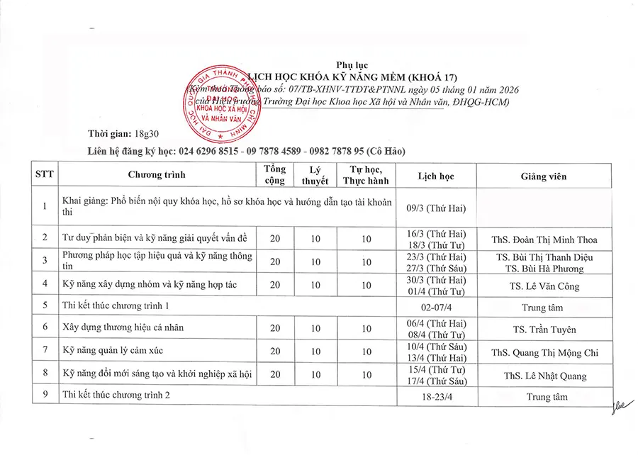Lịch học lớp Kỹ năng mềm (Khóa 17)