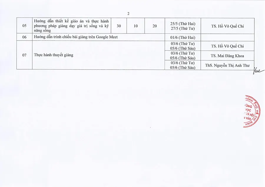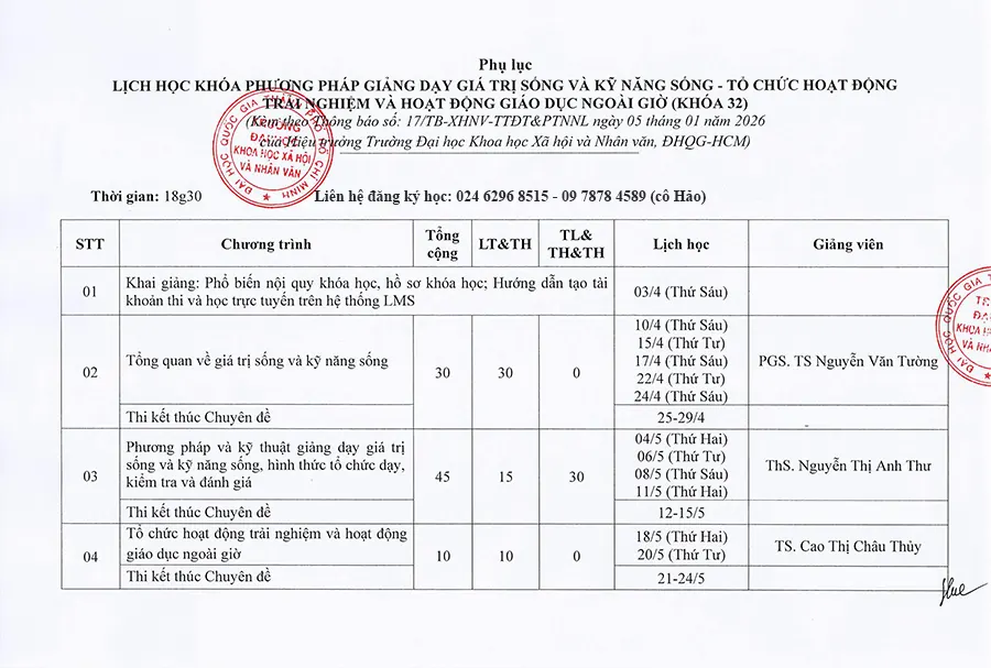 Lịch học lớp Kỹ năng sống cho Giáo viên K32
