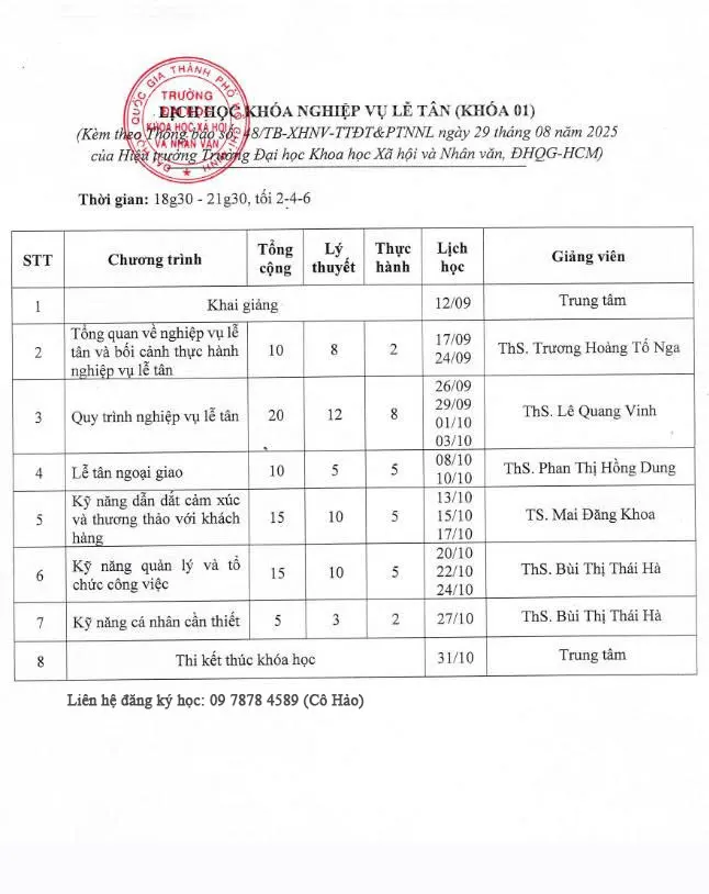 Lịch học lớp Nghiệp vụ Lễ tân tháng 9/2025