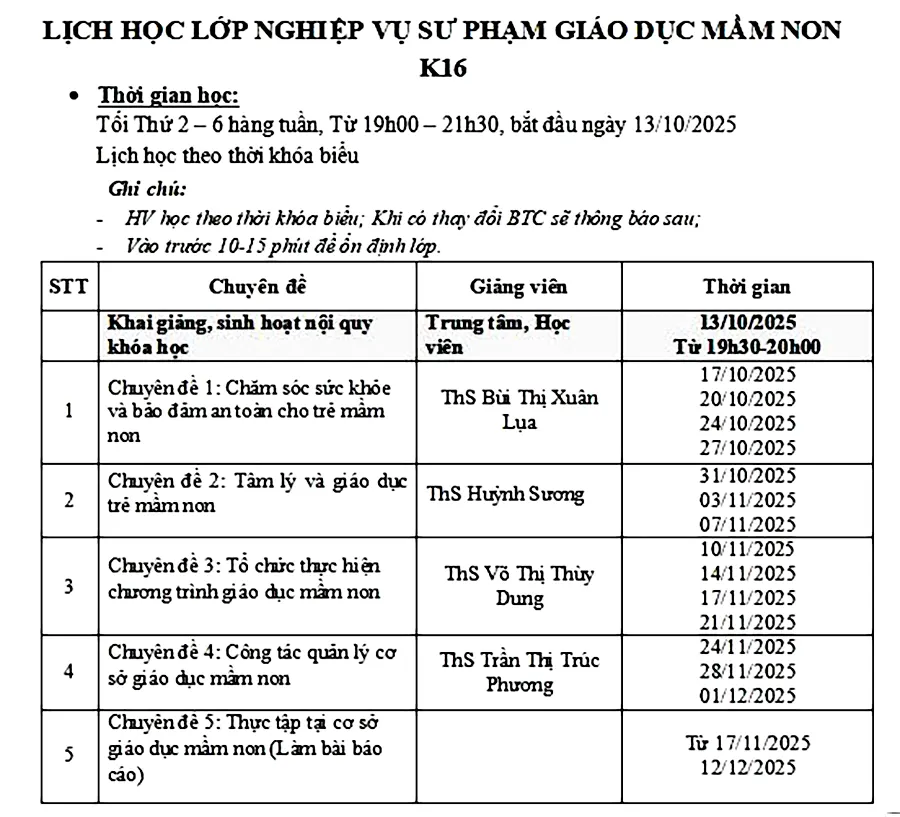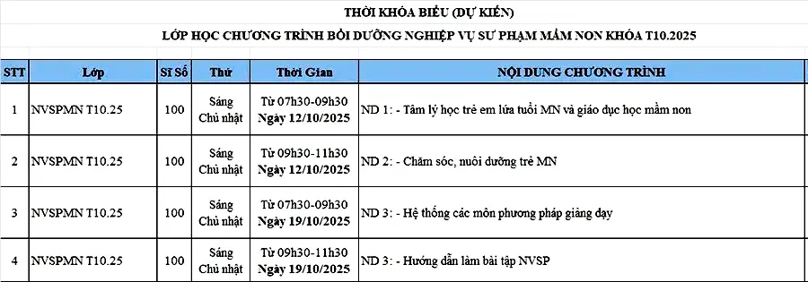 Lịch học lớp Nghiệp vụ sư phạm Mầm non – Tháng 10-2025