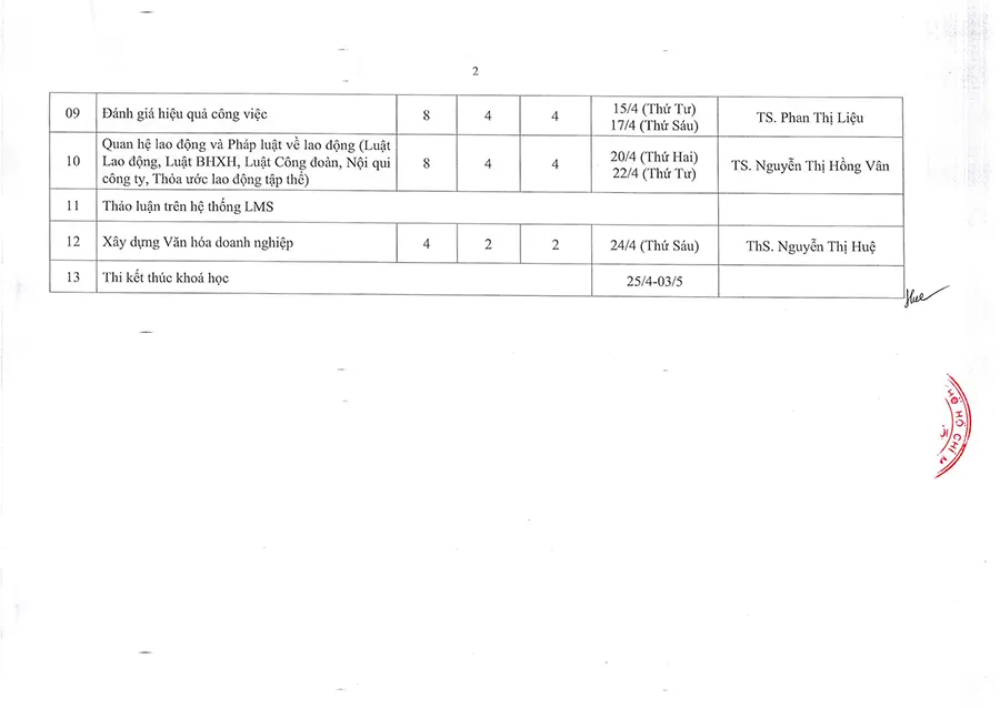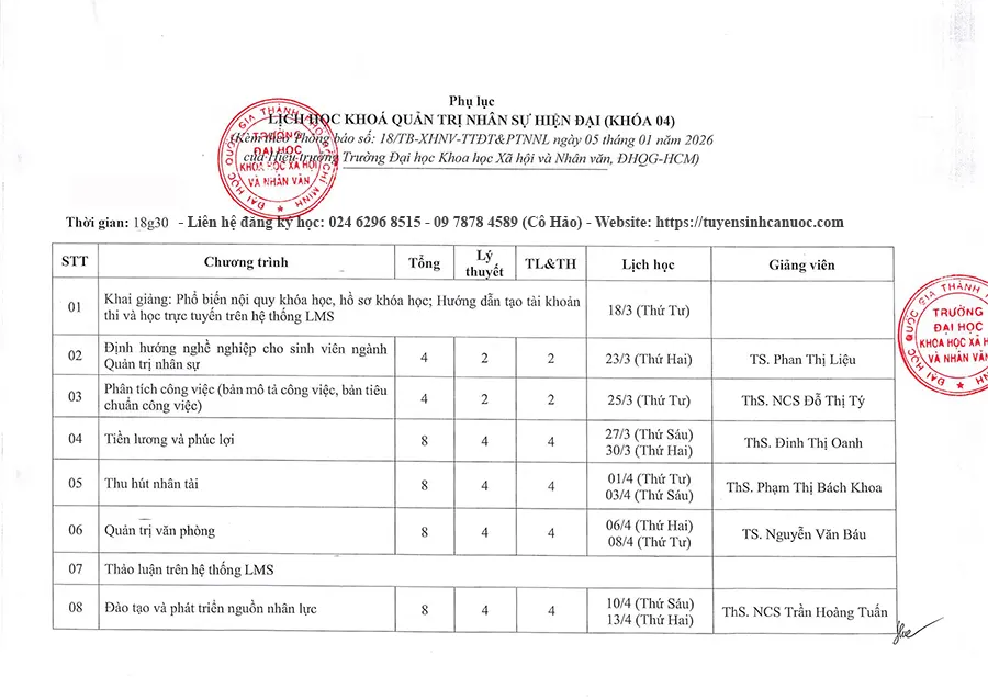 Lịch học lớp Quản trị nhân sự hiện đại K4