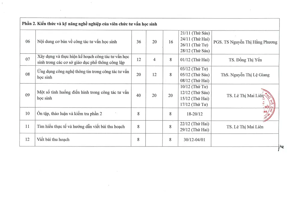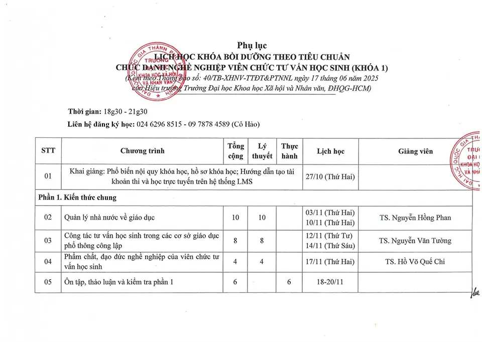 Lịch học lớp Tiêu chuẩn chức danh nghề nghiệp viên chức Tư vấn học sinh K1