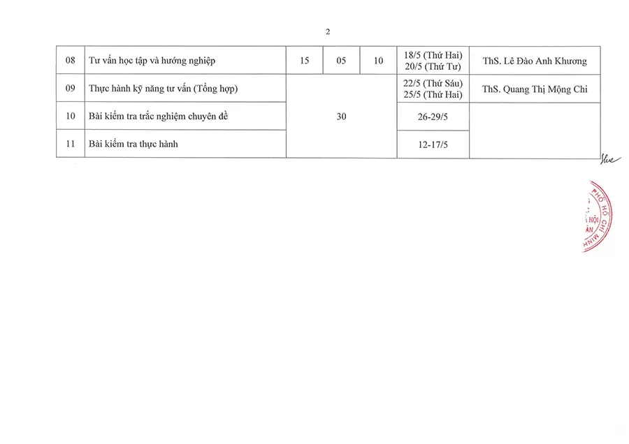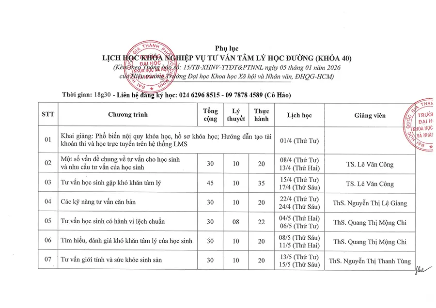Lịch học lớp Tư vấn tâm lý học đường K40