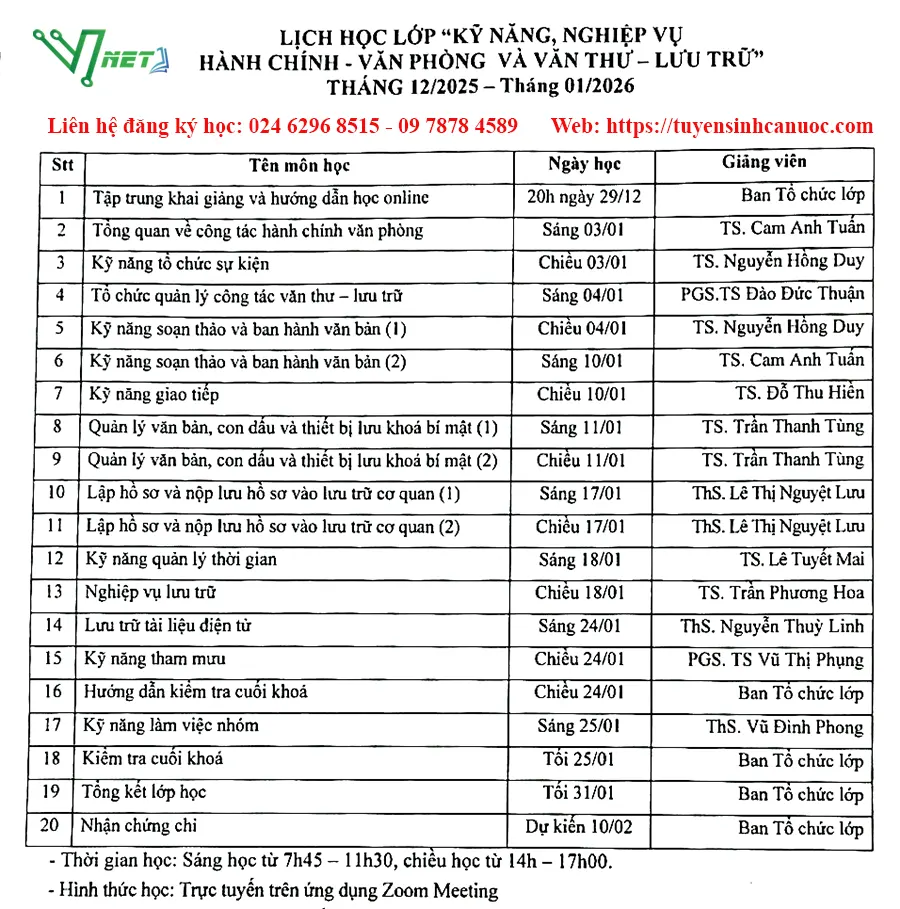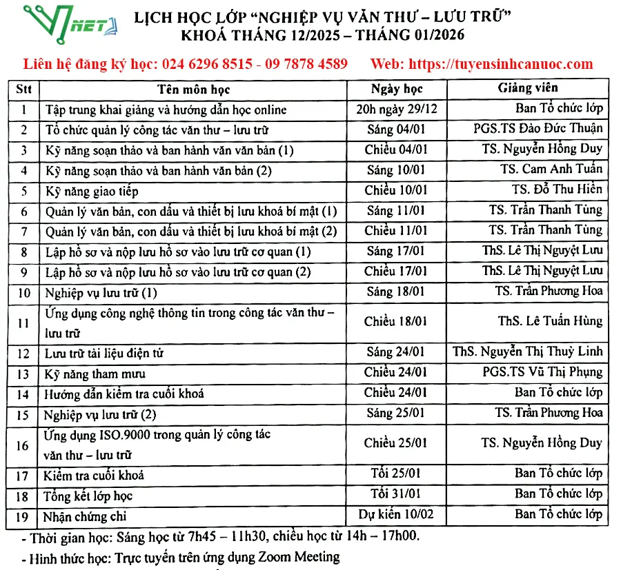 Lịch học lớp Văn thư -ĐH Nhân văn Hà Nội tháng 01/2026