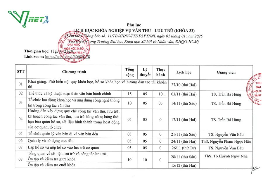 Lịch học lớp Văn thư lưu trữ HCM (Khóa 32)