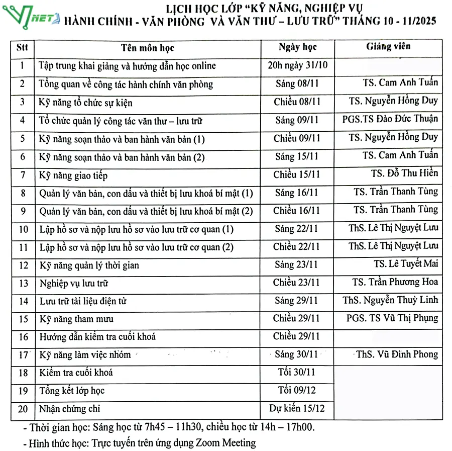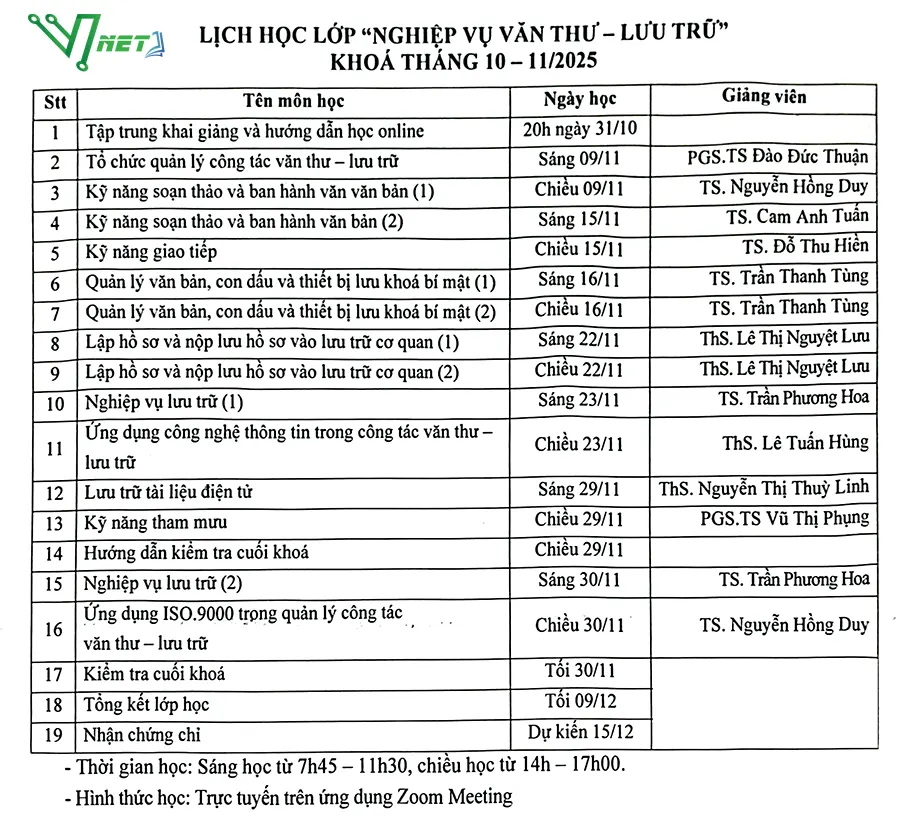 TB Lịch học lớp Văn thư Hà Nội tháng 11/2025