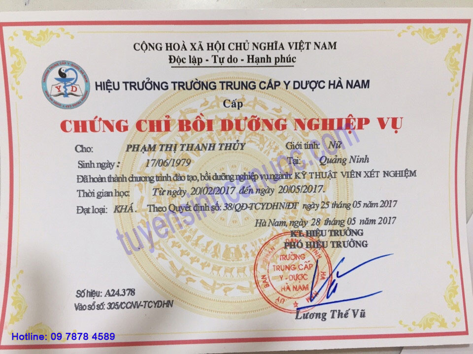 *** Chứng chỉ cuối khóa: Kết thúc khóa học, học viên được cấp chứng chỉ bồi dưỡng nghiệp vụ kỹ thuật viên xét nghiệm theo đúng quy định: