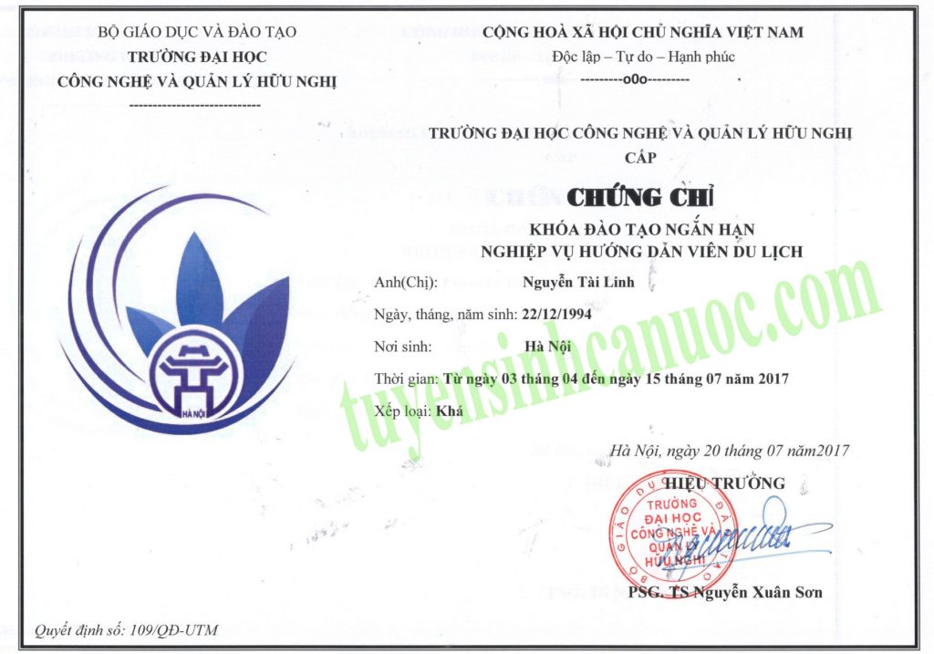 + Chứng chỉ: Chứng chỉ nghiệp vụ hướng dẫn viên du lịch theo mẫu phôi của Bộ Giáo dục & Đào tạo