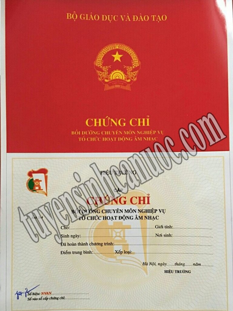 * CHỨNG CHỈ CUỐI KHÓA: Kết thúc khóa học, học viên được cấp chứng chỉ “Bồi dưỡng chuyên môn nghiệp vụ Tổ chức hoạt động âm nhạc” theo đúng quy định của Bộ Giáo dục và đào tạo, có giá trị trên toàn quốc.