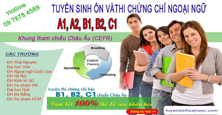 Tổ chức ôn và thi chứng chỉ A1, A2, B1, B2, C1 Châu Âu. Thi liên tục trong tháng, Chứng chỉ của Trường ĐH Thái Nguyên, ĐH Vinh, ĐH Hà Nội. 100% đạt kết quả cao.