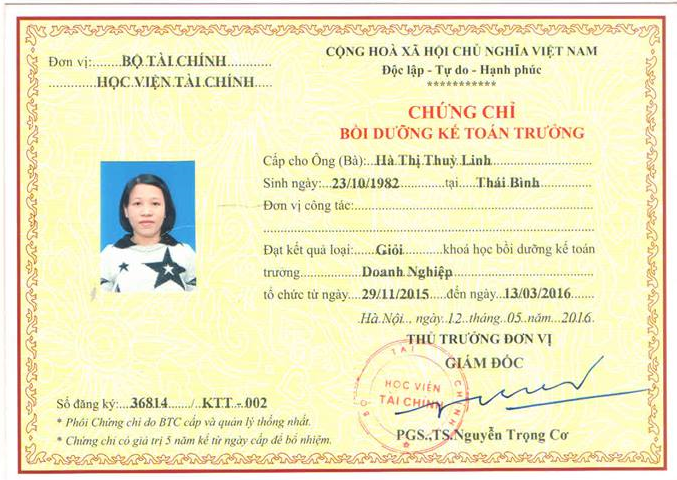 Kết thúc khóa học, học viên được cấp Chứng chỉ Kế toán trưởng Doanh nghiệp, Hành chính sự nghiệp theo đúng quy định của Bộ Tài Chính ban hành. Thời gian đào tạo 02 tháng.