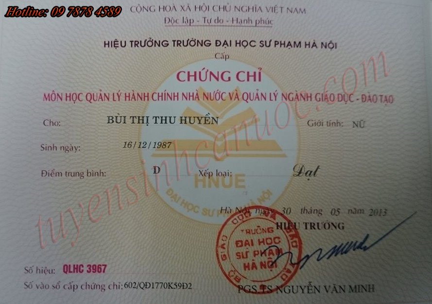 Đào tạo, cấp nhanh chứng chỉ quản lý hành chính nhà nước, quản lý giáo dục. Thời gian học 30 tiết các ngày thứ 7 và chủ nhật, học phí 2,000,000đ/khóa. Kết thúc khóa học, học viên được cấp chứng chỉ quản lý hành chính nhà nước, quản lý giáo dục do trường Đại học sư phạm Hà Nội cấp theo quy định của BGD, có giá trị trên toàn quốc và vô thời hạn