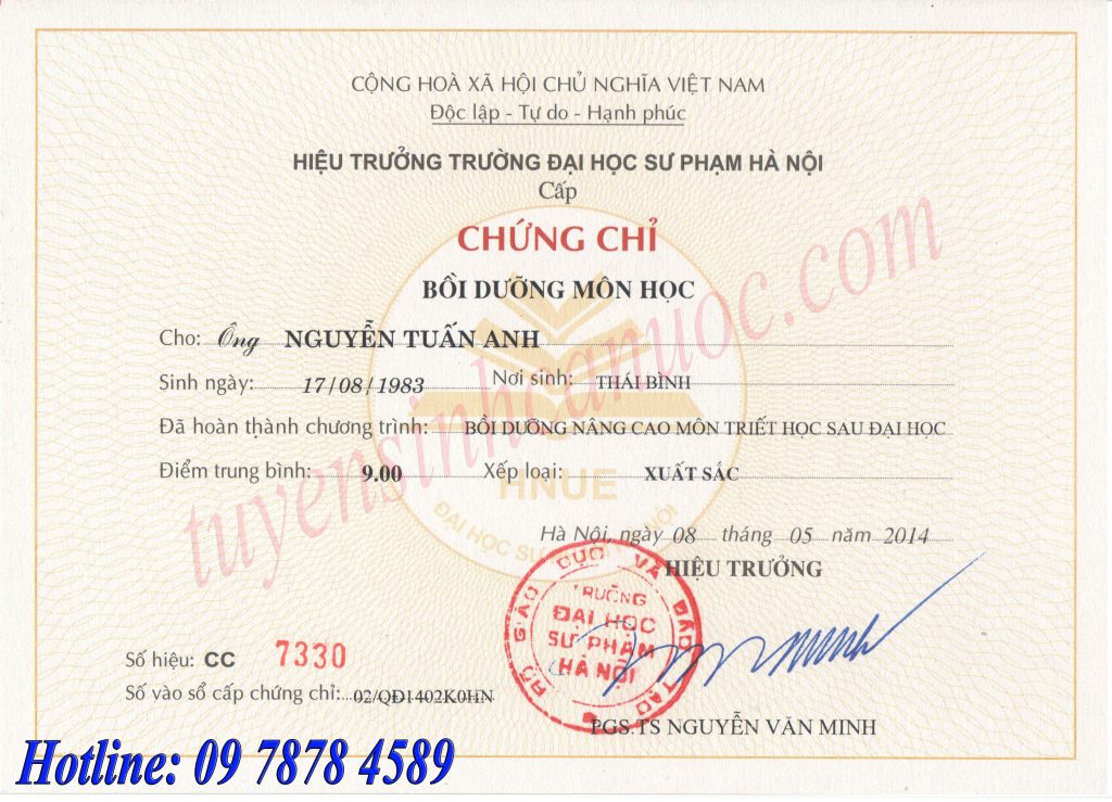 * Chứng chỉ cuối khóa học: Sau khi hoàn thành khóa học, những học viên đạt yêu cầu được trường Đại học Sư phạm Hà Nội cấp chứng chỉ “Bồi dưỡng nâng cao môn Triết học sau đại học “ theo đúng quy định của Bộ GD&ĐT.