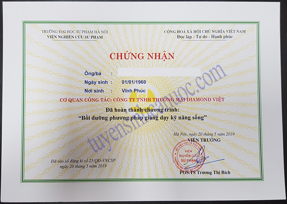 – Kết thúc khóa học, học viên được cấp chứng nhận hoàn thành khóa học “PHƯƠNG PHÁP GIẢNG DẠY KỸ NĂNG SỐNG” do Viện Nghiên cứu sư phạm trực thuộc trường Đại học sư phạm Hà Nội cấp theo đúng quy định, có giá trị trên toàn quốc.