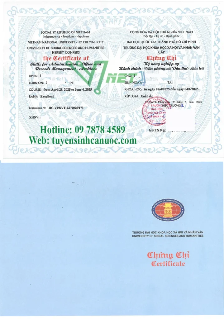 Kết thúc khoá học, học viên được thi cấp chứng chỉ “Nghiệp vụ Hành chính – Văn phòng và Văn thư – Lưu trữ” do trường ĐH Khoa học xã hội và nhân văn HCM cấp theo quy định của Bộ Giáo dục và Đào tạo, có giá trị trên toàn quốc và vô thời hạn.