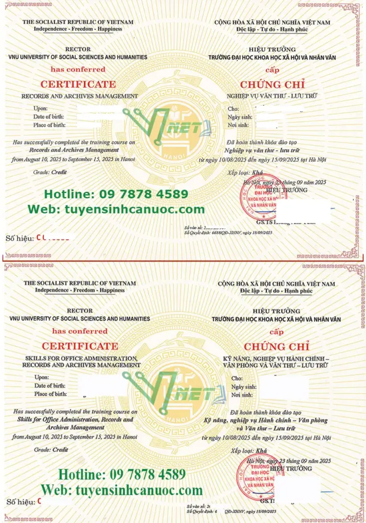 Kết thúc khoá học, học viên được thi cấp chứng chỉ “Kỹ năng, nghiệp vụ hành chính – văn phòng và văn thư – lưu trữ” hoặc “Nghiệp vụ Văn thư – Lưu trữ“,do trường ĐH Khoa học xã hội và nhân văn HN cấp theo quy định của Bộ Giáo dục và Đào tạo, có giá trị trên toàn quốc và vô thời hạn.