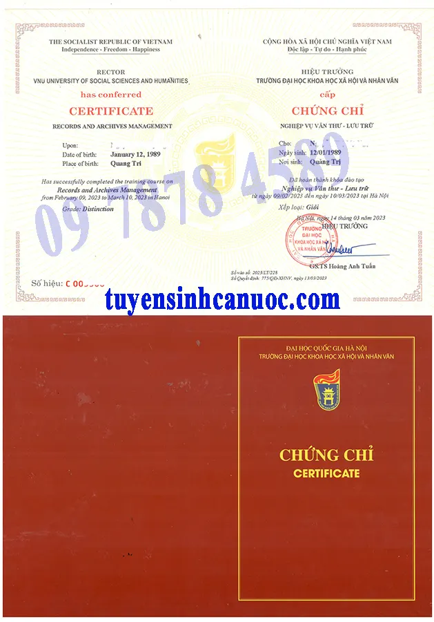 Kết thúc khoá học, học viên được thi cấp chứng chỉ “Kỹ năng, nghiệp vụ hành chính – văn phòng và văn thư – lưu trữ” hoặc “Nghiệp vụ Văn thư – Lưu trữ“,do trường ĐH Khoa học xã hội và nhân văn HN cấp theo quy định của Bộ Giáo dục và Đào tạo, có giá trị trên toàn quốc và vô thời hạn.