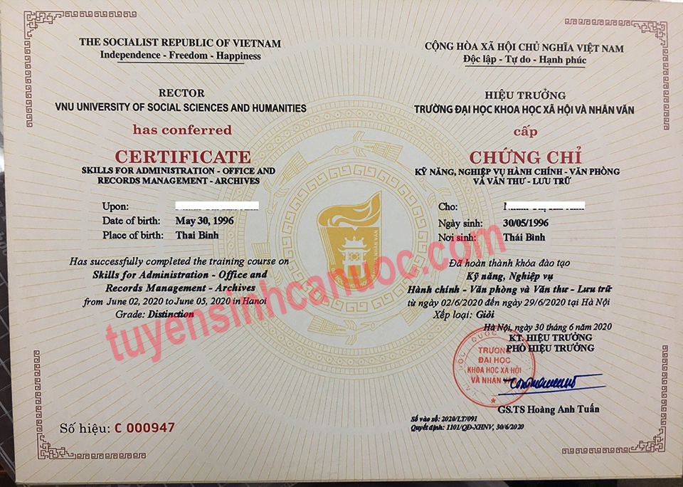 Kết thúc khoá học, học viên được thi cấp chứng chỉ “Kỹ năng, nghiệp vụ hành chính – văn phòng và văn thư – lưu trữ” do trường ĐH Khoa học xã hội và nhân văn cấp theo quy định của Bộ Giáo dục và Đào tạo, có giá trị trên toàn quốc và vô thời hạn.