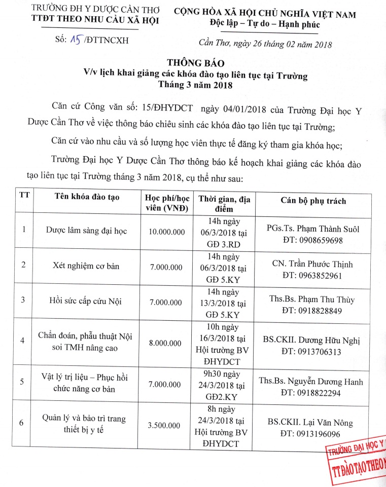 LỊCH KHAI GIẢNG CÁC LỚP BỒI DƯỠNG NGẮN HẠN