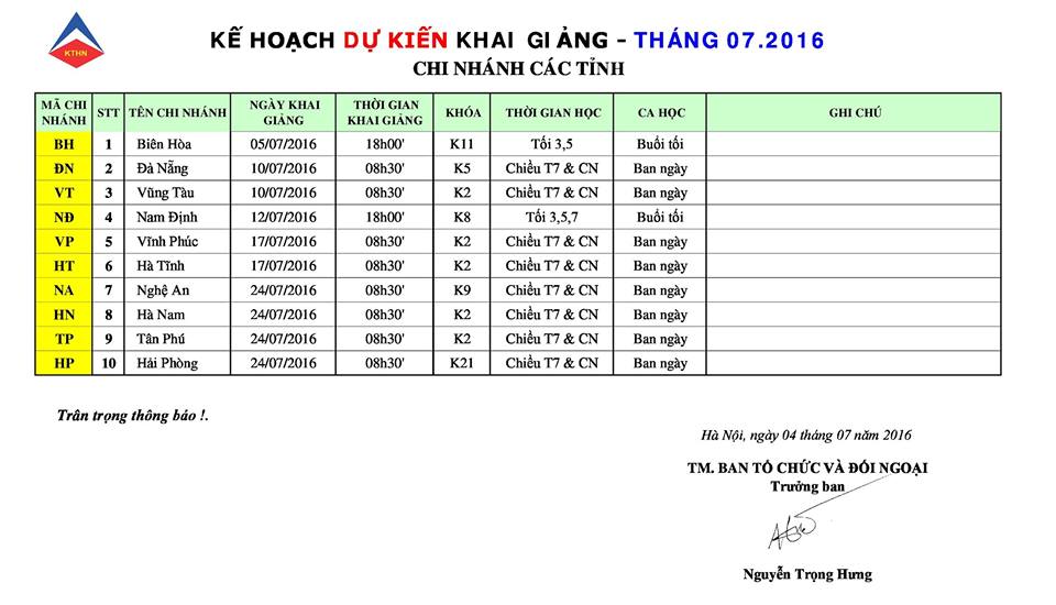 Lịch khai giảng tại các tỉnh tháng 7/2016