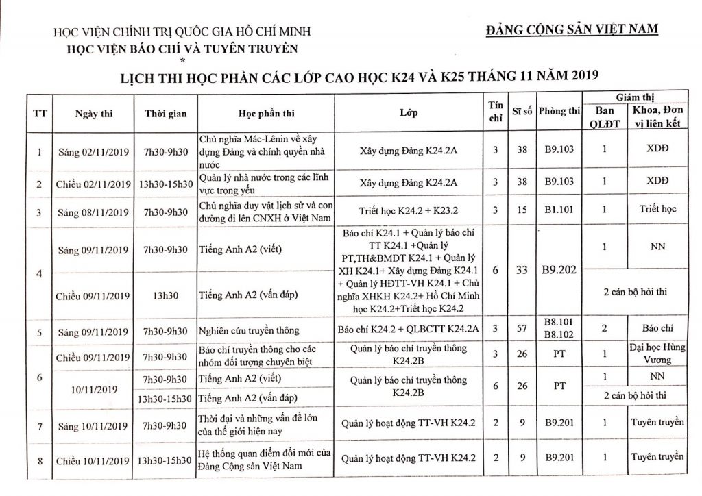 LỊCH THI KẾT THÚC HỌC PHẦN NGHIỆP VỤ TRIẾT HỌC SAU ĐẠI HỌC