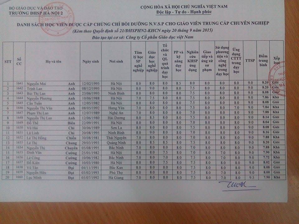 Lịch thi lớp NVSP Giảng viên K14