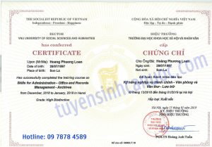 Mẫu chứng chỉ Văn thư lưu trữ – Hành chính văn phòng. Học viên được cấp chứng chỉ do trường Đại học Khoa học Xã hội và Nhân văn – Đại học Quốc Gia Hà Nội cấp theo quy định cảu BGD. Thời gian đào