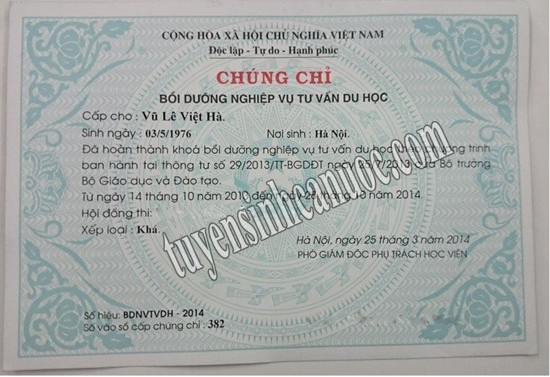 Mẫu chứng chỉ nghiệp vụ tư vấn du học. Thời gian đào tạo 15 buổi theo quy định. Kết thúc khóa học, học viên được cấp chứng chỉ theo đúng quy định của BGD&ĐT