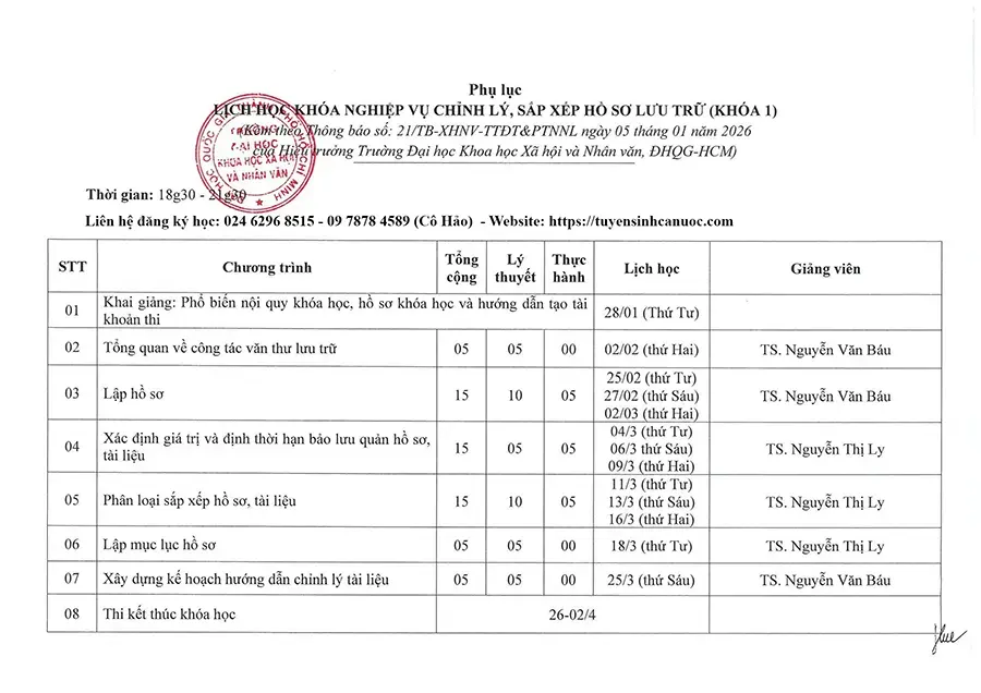 Trung tâm liên kết với Trường ĐH Khoa học xã hội và nhân văn HCM mở lớp “Nghiệp vụ chỉnh lý, sắp xếp hồ sơ lưu trữ”, nội dung chương trình cụ thể như sau: