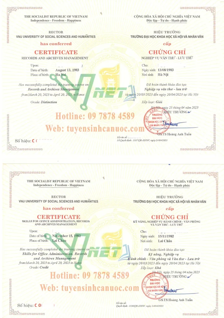 Kết thúc khoá học, học viên được thi cấp chứng chỉ “Kỹ năng, nghiệp vụ hành chính – văn phòng và văn thư – lưu trữ” hoặc “Nghiệp vụ Văn thư – Lưu trữ“,do trường ĐH Khoa học xã hội và nhân văn HN cấp theo quy định của Bộ Giáo dục và Đào tạo, có giá trị trên toàn quốc và vô thời hạn.