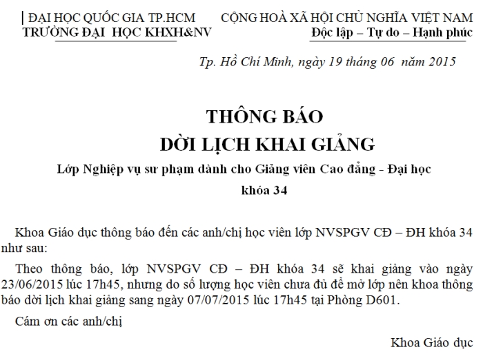 Thông báo khai giảng các lớp NVSP giảng viên