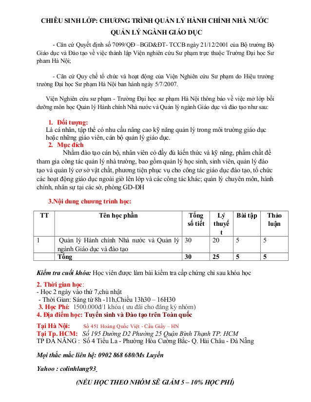 Thông báo mở lớp Quản lý hành chính nhà nước và Quản lý ngành GD-ĐT. Kết thúc khóa học, học viên được thi cấp chứng chỉ theo quy định của Bộ Giáo dục và Đào tạo. Thời gian học: 30 tiết; Học phí: 2.000.000đ/ khóa học.