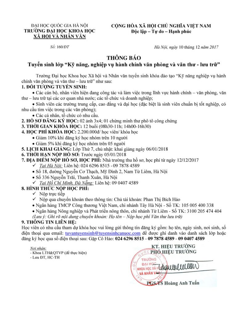Trường ĐH Khoa học xã hội và nhân văn liên kết với Trung tâm Nghiệp vụ Sư phạm Quốc Gia mở lớp “Văn thư lưu trữ – Hành chính văn phòng”, đặt lớp tại Trung tâm Nghiệp vụ sư phạm Quốc Gia, cụ thể chương trình như sau: